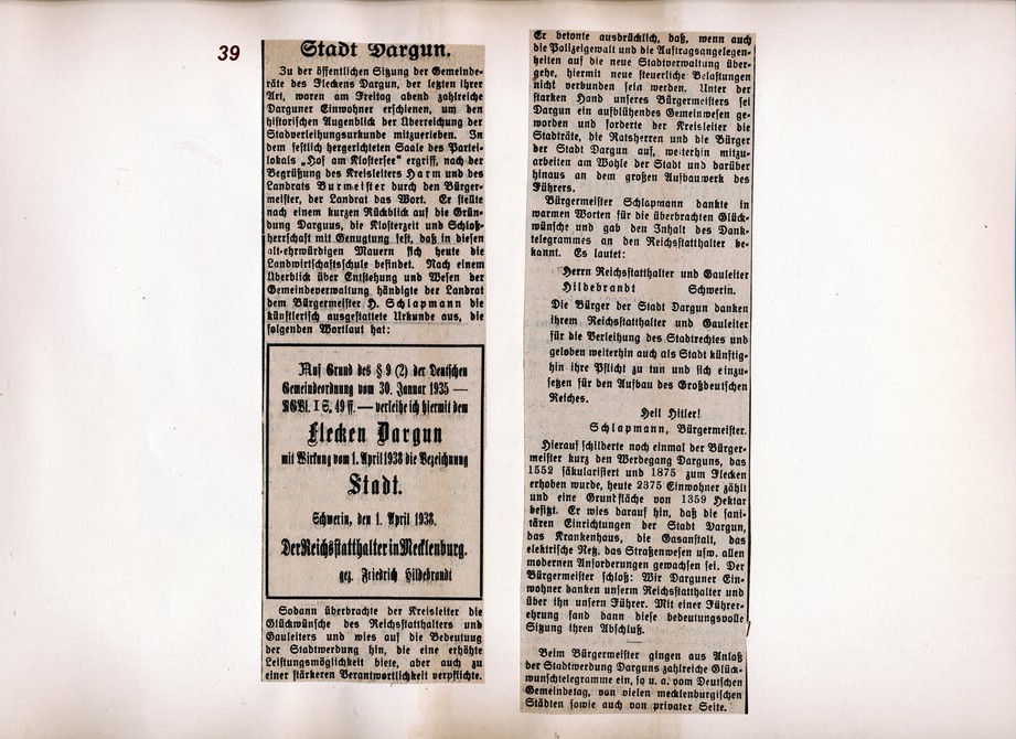 1938 Vom Flecken Dargun zur Stadt: